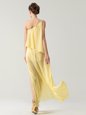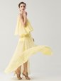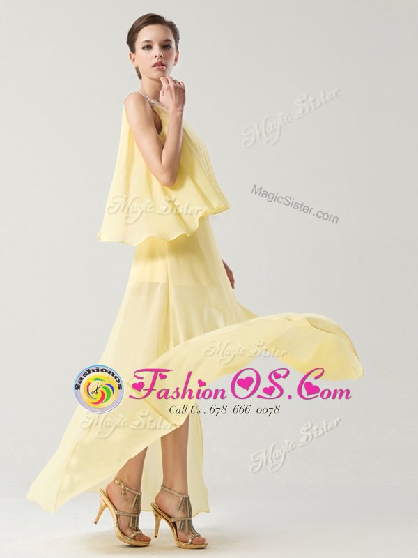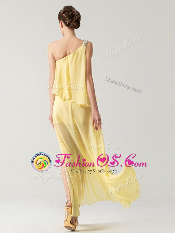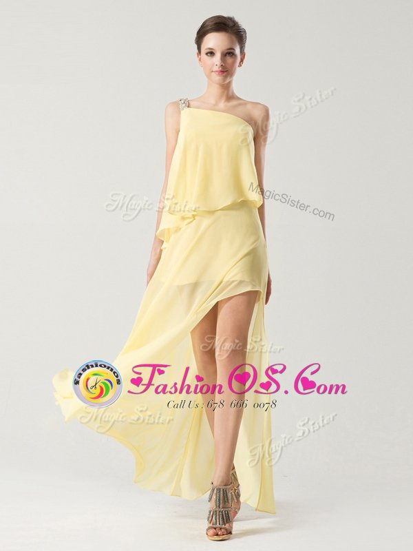 Home >  Prom Dresses >  Perfect Prom Dresses > One Shoulder Yellow Sleeveless High Low Beading and Ruching Zipper Prom Evening Gown