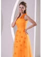 This luxurious orange evening gown will make you sparkle at prom. This stunning dress features a pleated bodice with a gorgeous one shoulder design which decorated by floral appliques. Under the tulle layer, the floor length skirt is with hand made flower throughout. A hidden zipper on the side makes the skirt easy off and on and secures the dress in place.