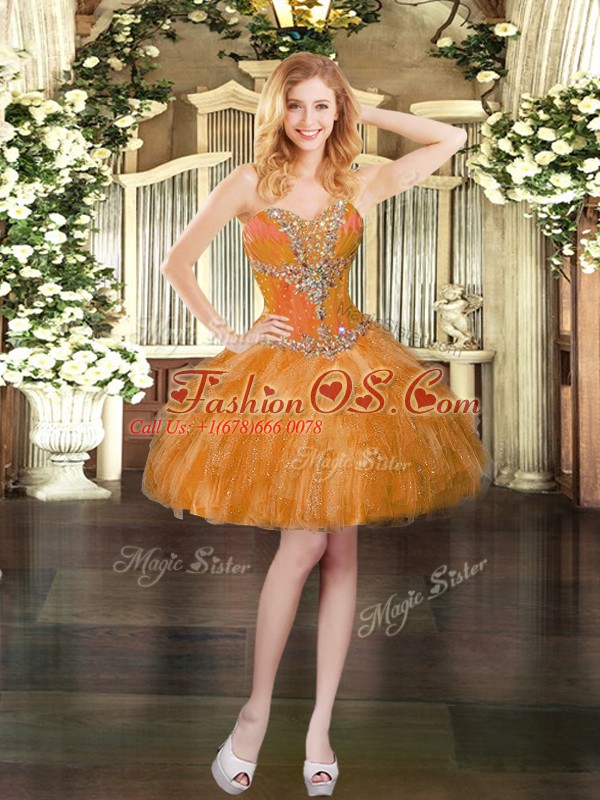 Home >  Prom Dresses >  Fashionable Prom Dresses > Orange Lace Up Prom Gown Beading and Ruffles Sleeveless Mini Length