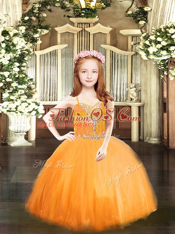 Home >  Special Occasion Dresses >  Pretty Little Girl Pageant Dresses > Orange Lace Up Spaghetti Straps Beading Pageant Gowns For Girls Tulle Sleeveless