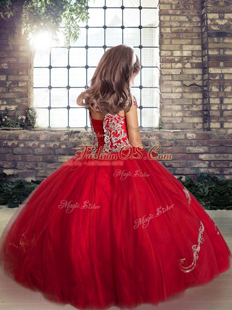 Home >  Special Occasion Dresses >  Beautiful Kids Pageant Dresses > Orange Red Ball Gowns Off The Shoulder Sleeveless Tulle Floor Length Lace Up Beading Glitz Pageant Dress