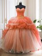 Home >  Quinceanera Dresses >  Sweet 16 Dresses > Orange Red Ball Gowns Organza Sweetheart Sleeveless Beading and Ruffled Layers With Train Lace Up Sweet 16 Dress Sweep Train