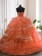 Orange Red Ball Gowns Organza Sweetheart Sleeveless Beading and Ruffled Layers With Train Lace Up Sweet 16 Dress Sweep Train