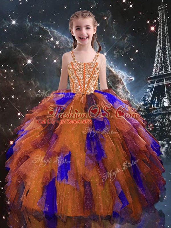 Orange Red Ball Gowns Tulle Straps Sleeveless Beading and Ruffles Floor Length Lace Up Glitz Pageant Dress
