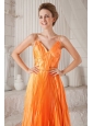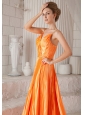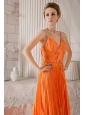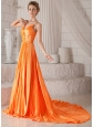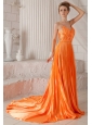 Star in your own fairytale at your 2012 prom or formal ! This orange prom dress has spaghetti straps and a deep sweetheart and a fine chain in the mid-section on the irregular ruched bodice that show your perfect curve. The dress with a cathedral train sways beautifully across the floor when you move, as if you're floating on air. Miss it equal to eclipse your wonderful day!