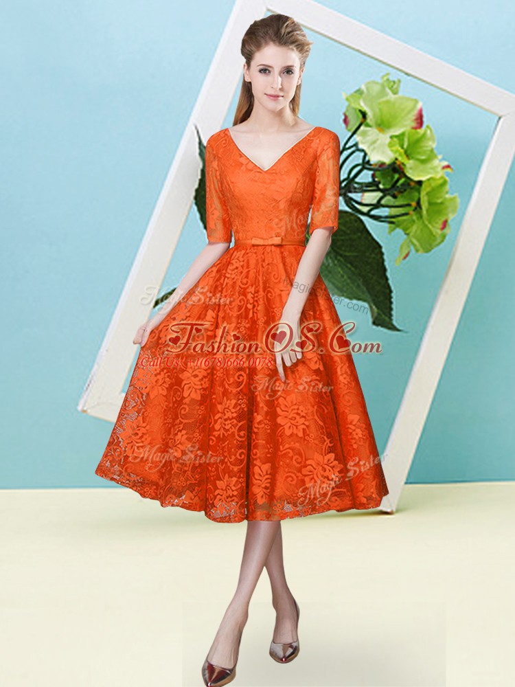 Orange Red Lace Up V-neck Bowknot Bridesmaids Dress Lace Half Sleeves