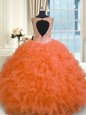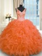 Home >  Quinceanera Dresses >  Cute Quinceanera Dresses > Orange Red Organza Zipper V-neck Sleeveless Floor Length Quince Ball Gowns Beading and Ruffles