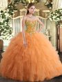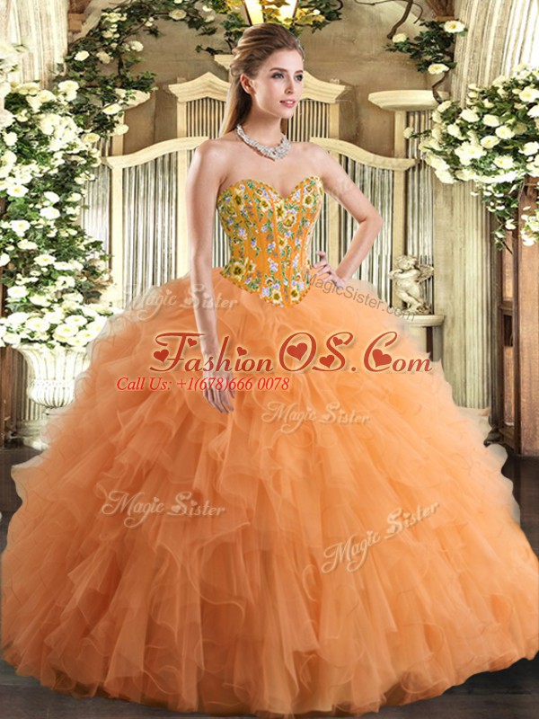 Orange Sleeveless Floor Length Embroidery and Ruffles Lace Up Quince Ball Gowns