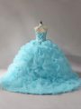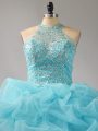 Organza Halter Top Sleeveless Court Train Lace Up Beading and Pick Ups Sweet 16 Quinceanera Dress in Aqua Blue