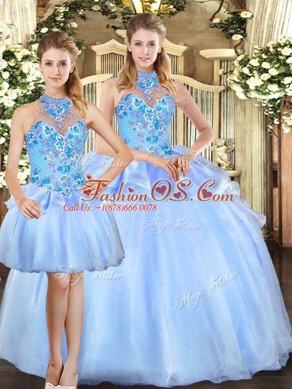 Organza Halter Top Sleeveless Lace Up Embroidery Sweet 16 Quinceanera Dress in Blue