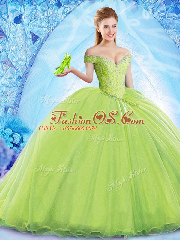 Organza Off The Shoulder Sleeveless Brush Train Lace Up Beading Sweet 16 Quinceanera Dress in Yellow Green