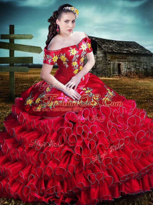 Organza Off The Shoulder Sleeveless Lace Up Embroidery and Ruffles Vestidos de Quinceanera in Red