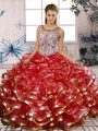 Organza Scoop Sleeveless Lace Up Beading and Ruffles 15th Birthday Dress in Red