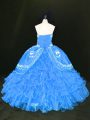 Organza Strapless Sleeveless Lace Up Embroidery and Ruffles Quinceanera Gown in Blue