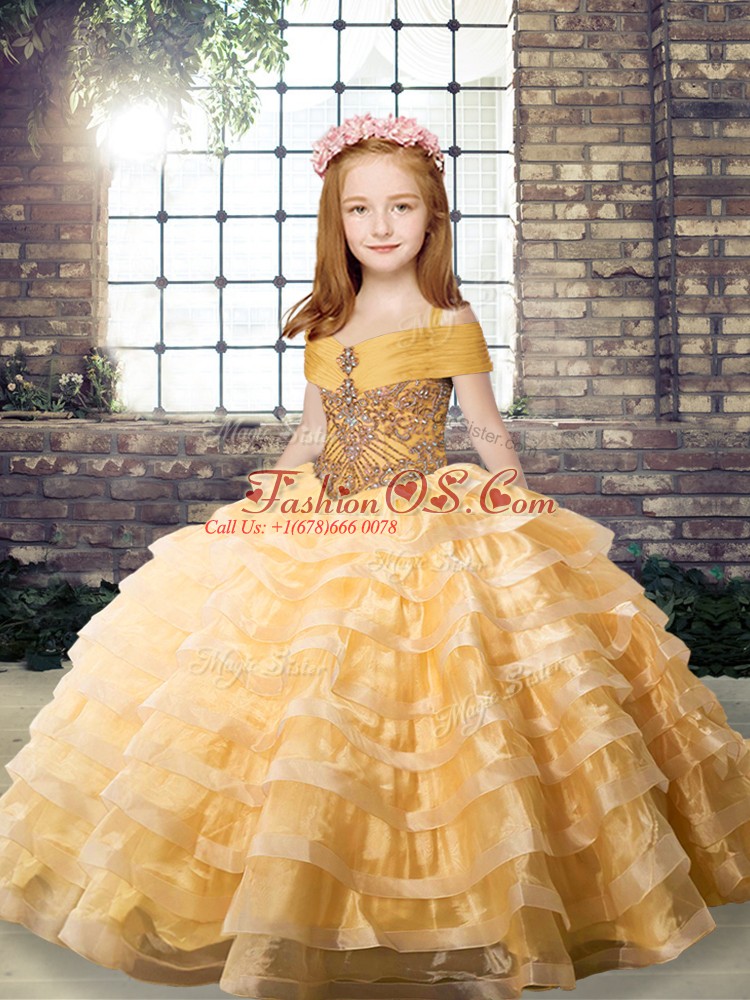 Home >  Special Occasion Dresses >  2018 Little Girl Pageant Dresses > Organza Straps Sleeveless Brush Train Lace Up Beading and Ruffled Layers Little Girls Pageant Gowns in Orange