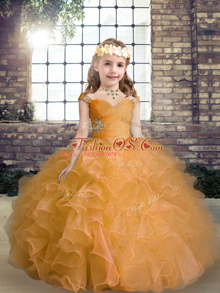 Home >  Special Occasion Dresses >  2018 Little Girl Pageant Dresses > Organza Straps Sleeveless Lace Up Beading and Ruffles Child Pageant Dress in Orange