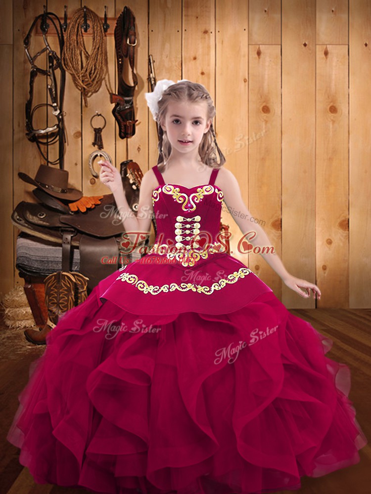 Home >  Special Occasion Dresses >  Lovely Little Girl Pageant Dresses > Organza Straps Sleeveless Lace Up Embroidery and Ruffles Little Girls Pageant Dress in Fuchsia