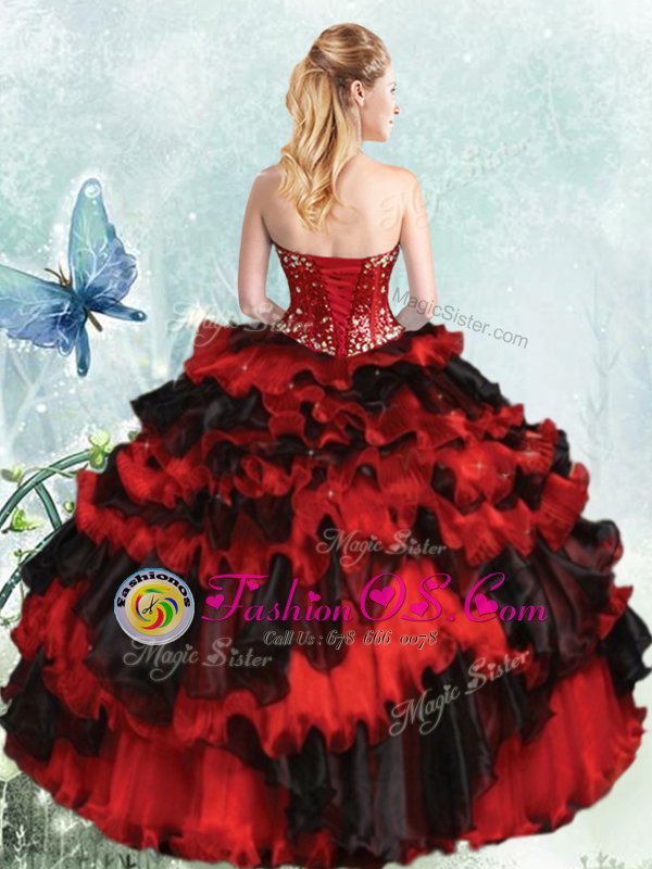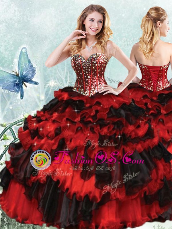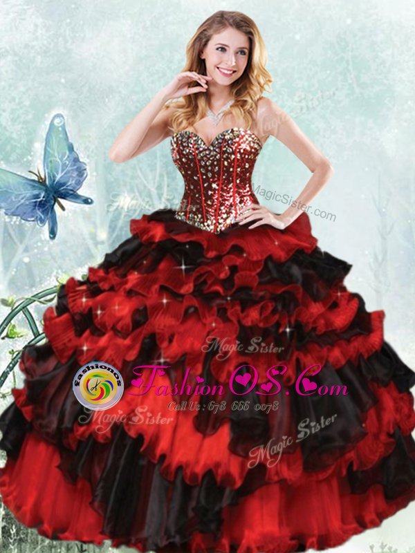 Organza Sweetheart Sleeveless Lace Up Beading and Ruffled Layers and Sequins Quinceanera Gowns in Red And Black