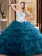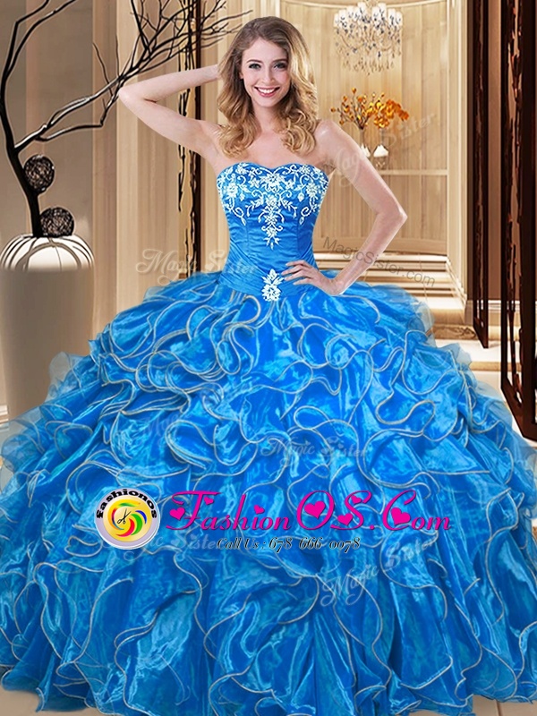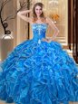 Organza Sweetheart Sleeveless Lace Up Embroidery and Ruffles Quince Ball Gowns in Blue