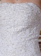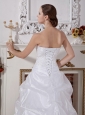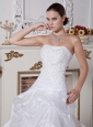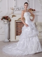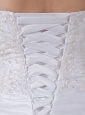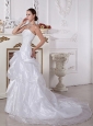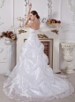 A ravishing array of tucks shapes the strapless bodice of this radiant wedding gown. Delicate lace appliques stretches all over the fitted bodice creates a graceful look. The flared, floor-length skirt with pick ups and appliques form a full shape, a dramatic court train at the back finishes off this elegant and exquisite design.