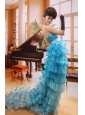 Paillette Over Skirt Aqua Blue Strapless Ruffles Prom Gowns With Organza Court Train Custom Made