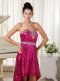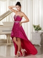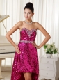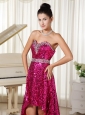 Heads will turn at your arrival if you wear this fabulous stunning dress. This red high-low style prom dress features a sweetheart neckline and the whole dress is adorned with fashionable and colorful paillettes. The rhinestones decorates the edge of bust and the waist, achieve a sharp contrast. An elegant train that cascades to the floor. You are sure to be the shining star.