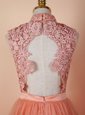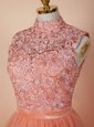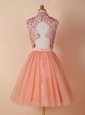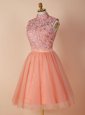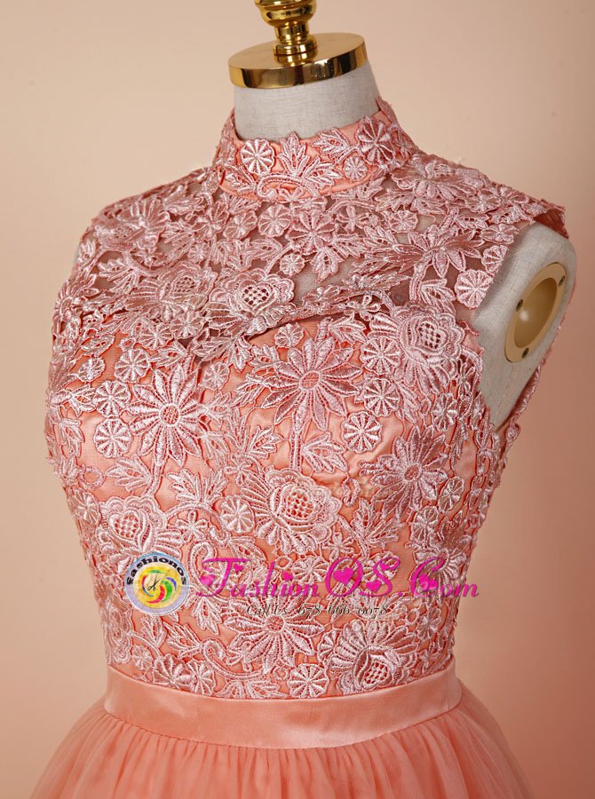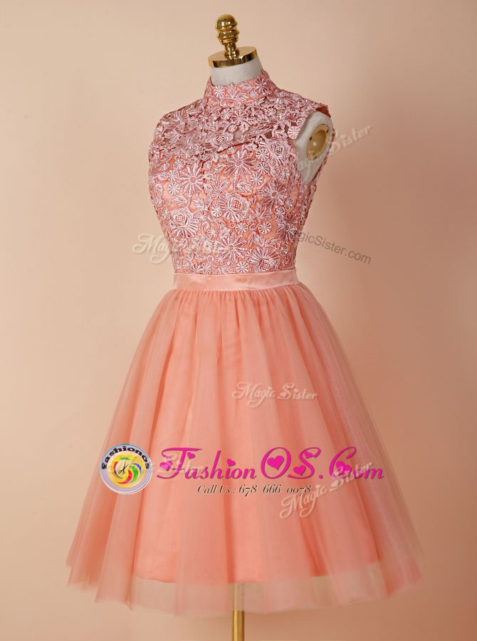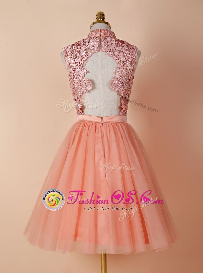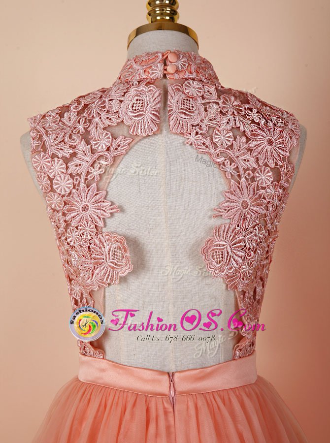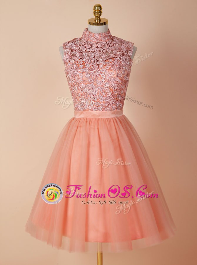Peach Backless Prom Dress Appliques Sleeveless Knee Length
