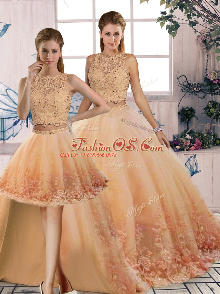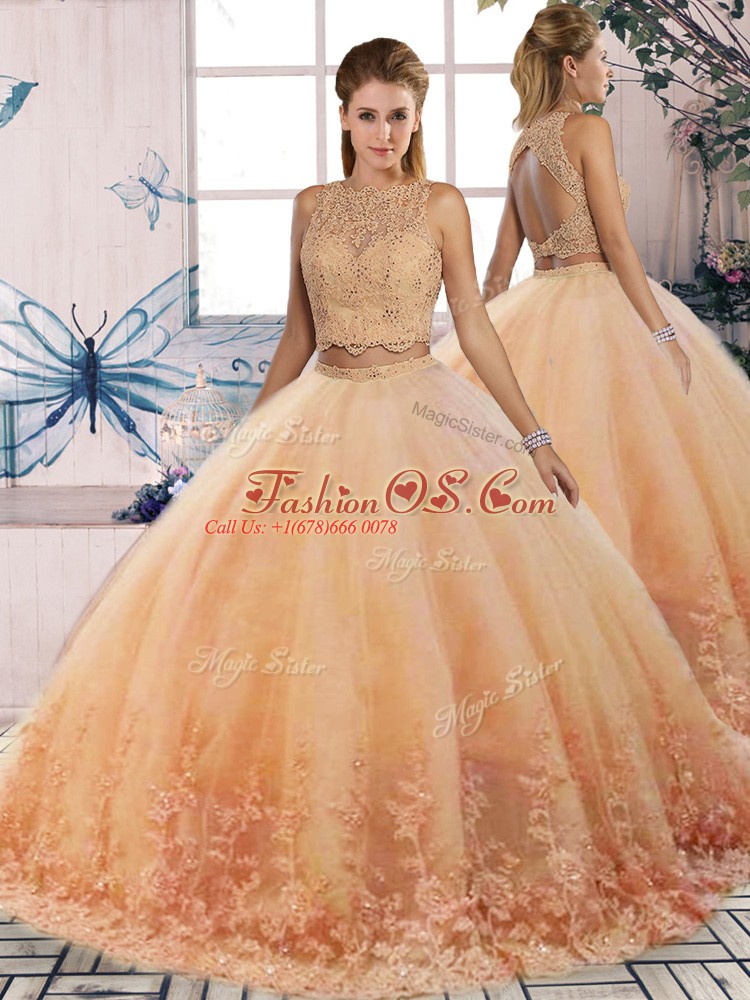 Peach Backless Quinceanera Dress Lace Sleeveless Sweep Train