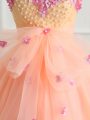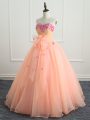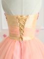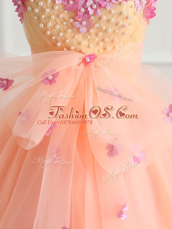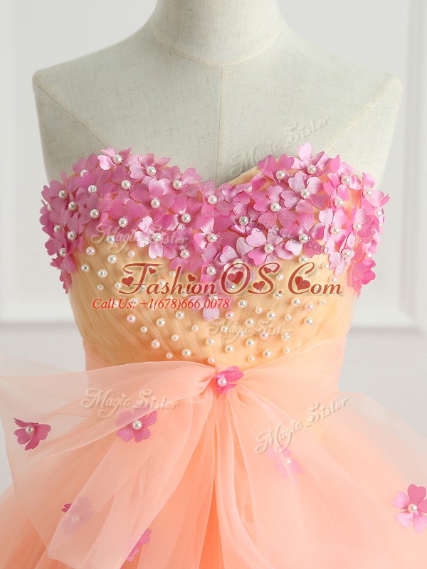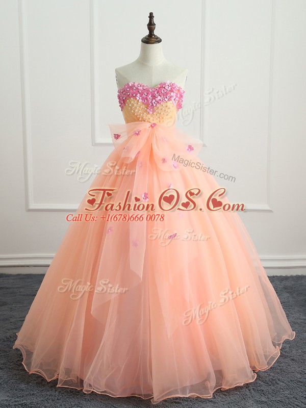Home >  Quinceanera Dresses >  In Stock Quinceanera Dresses > Peach Ball Gowns Sweetheart Sleeveless Organza Floor Length Lace Up Beading and Appliques and Bowknot 15 Quinceanera Dress