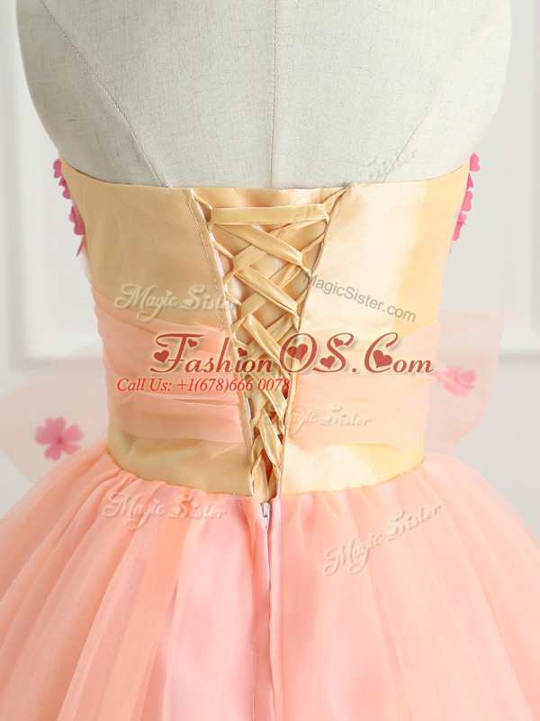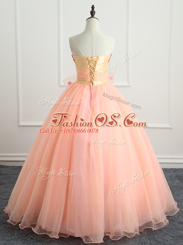 Peach Ball Gowns Sweetheart Sleeveless Organza Floor Length Lace Up Beading and Appliques and Bowknot 15 Quinceanera Dress