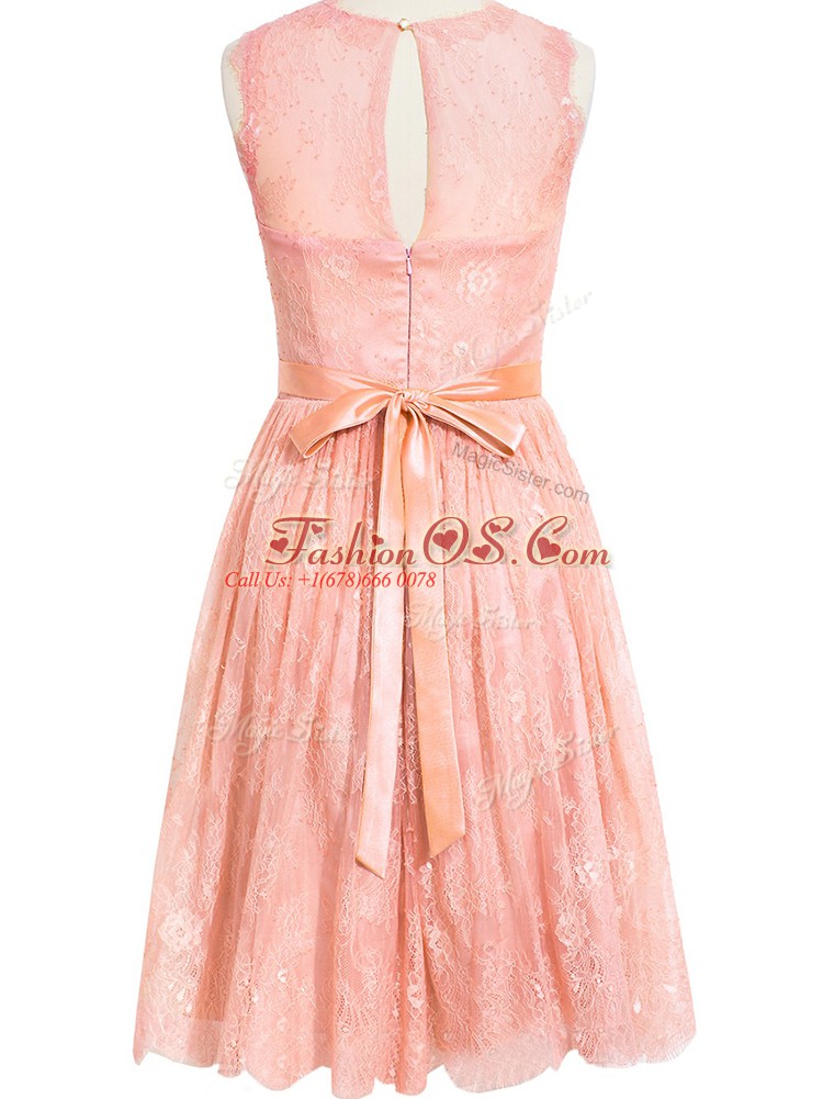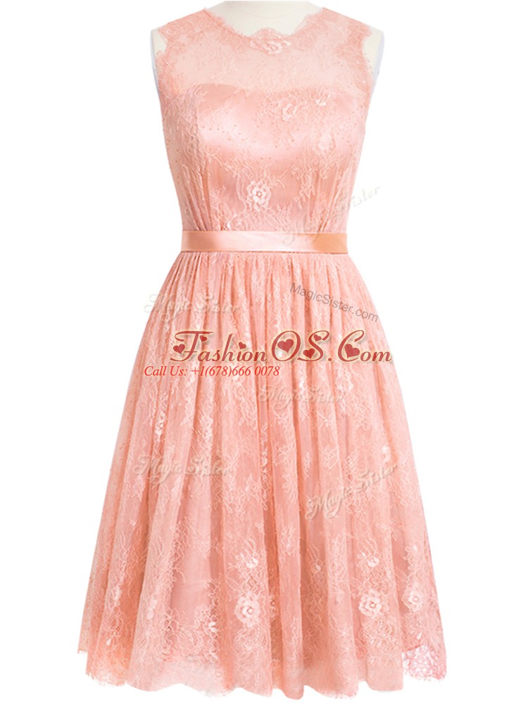 Peach Lace Zipper Scoop Sleeveless Knee Length Dama Dress Lace