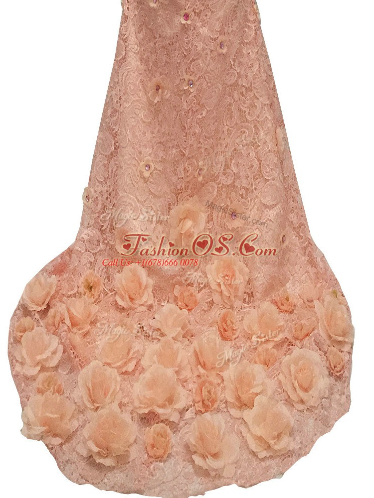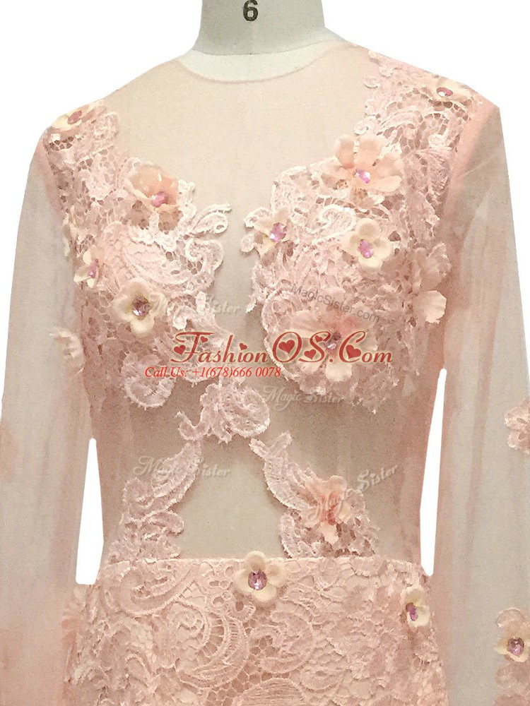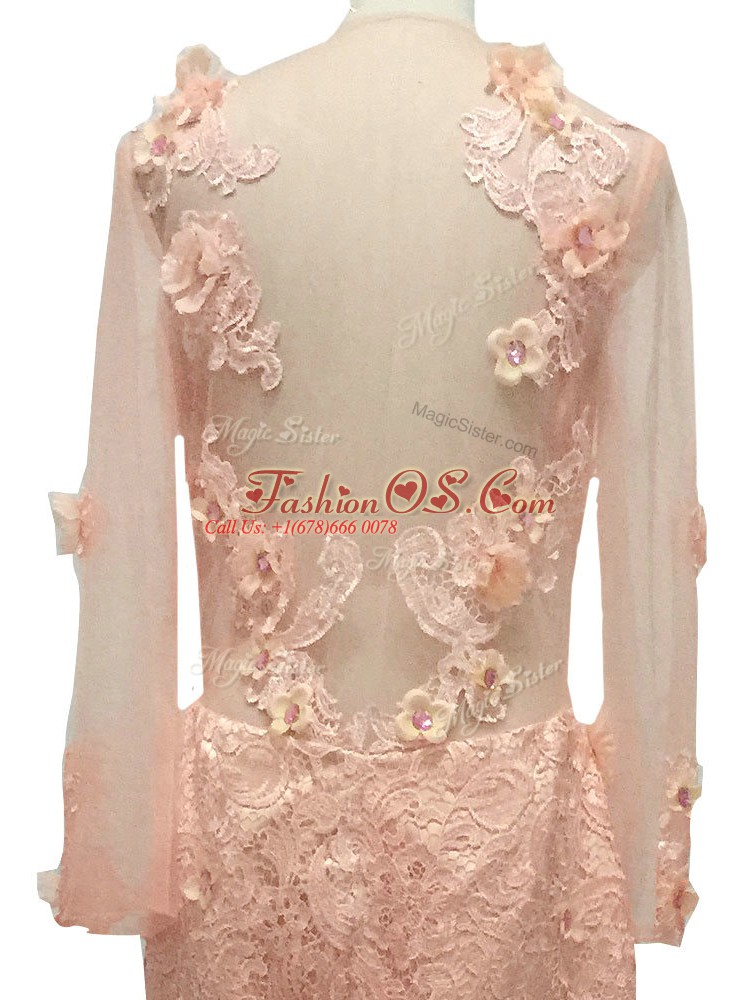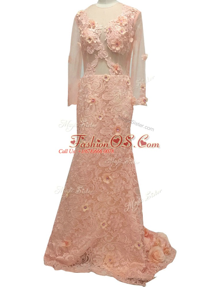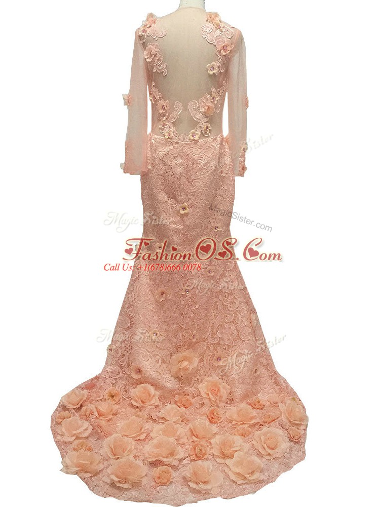 Peach Scoop Neckline Beading and Hand Made Flower Mother Of The Bride Dress Long Sleeves Side Zipper