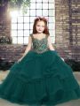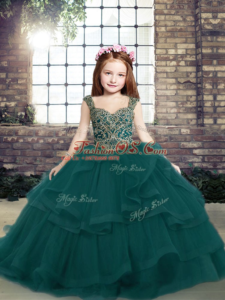 Peacock Green Straps Neckline Beading and Ruffles Little Girl Pageant Gowns Sleeveless Lace Up