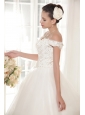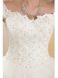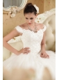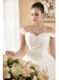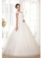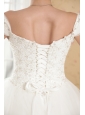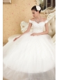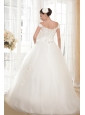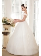 Simply designed dresses can also make a dramatic first impression, this white wedding dress is the perfect example. The elegant off the shoulder style bodice features embellished beadwork and exquisite appliques. The full A-line tulle skirt flows freely to the floor with scattered appliqued decorations, and an adjustable lace up in the back completes this fabulous design.