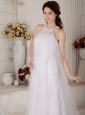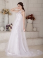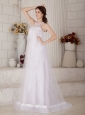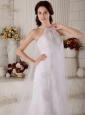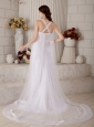 It's one of those great fabrics that makes a girl feel extra feminine and special when worn and adds an element of beauty to anything it embellishes. This dress features a beaded scoop neckline which leads two beads trimed bands crossed in the back. The floor length dress decorates with exquisite appliques is covered with a layer of see-through tulle throughout gives it a light, airy feel. The train with a circle of white band adds beauty and grace to the dress. You will never be regret in choosing this dress.
