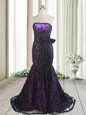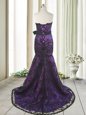 Perfect Mermaid Purple Satin and Lace Lace Up Homecoming Dress Sleeveless With Train Sweep Train Bowknot and Belt
