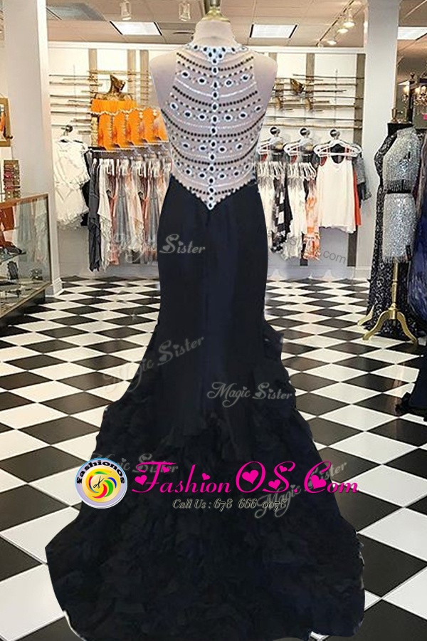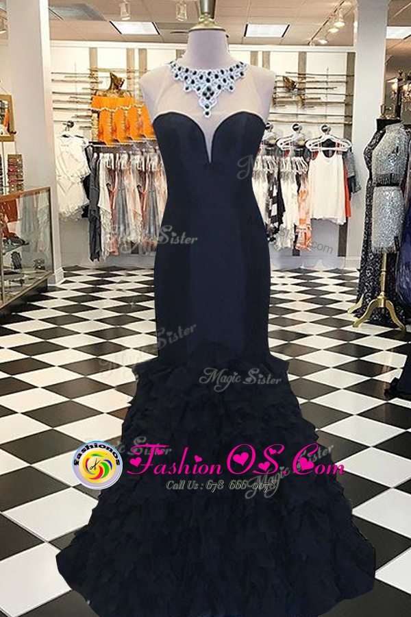 Perfect Mermaid Scoop Sleeveless Elastic Woven Satin Sweep Train Side Zipper Celebrity Evening Dresses in Black for with Beading