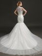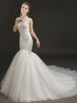 Perfect Mermaid White Wedding Gown Wedding Party and For with Lace and Appliques High-neck Sleeveless Court Train Zipper