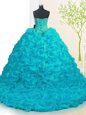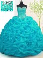 Home >  Quinceanera Dresses >  Discount Quinceanera Dresses > Perfect Organza Sweetheart Sleeveless Brush Train Lace Up Beading and Ruffles Quinceanera Dresses in Aqua Blue
