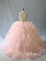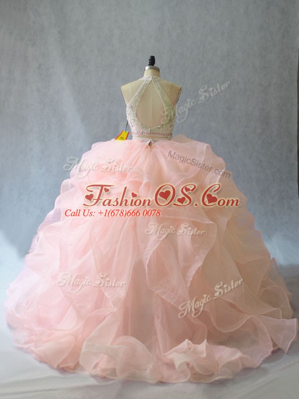 Perfect Peach Two Pieces Organza Halter Top Sleeveless Beading and Ruffles Backless Vestidos de Quinceanera Brush Train