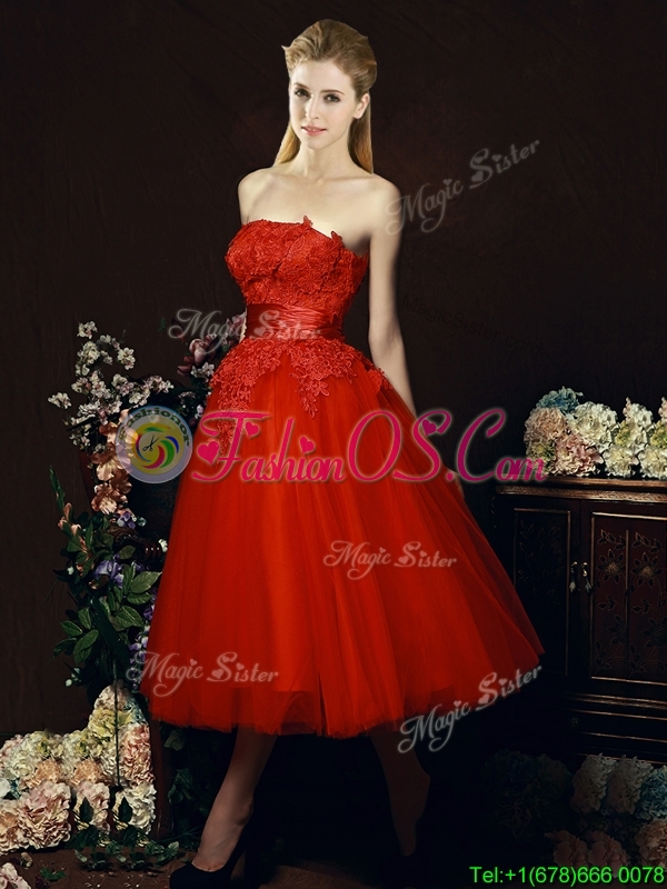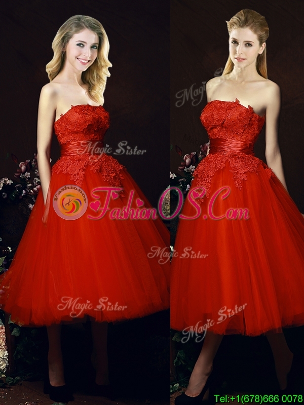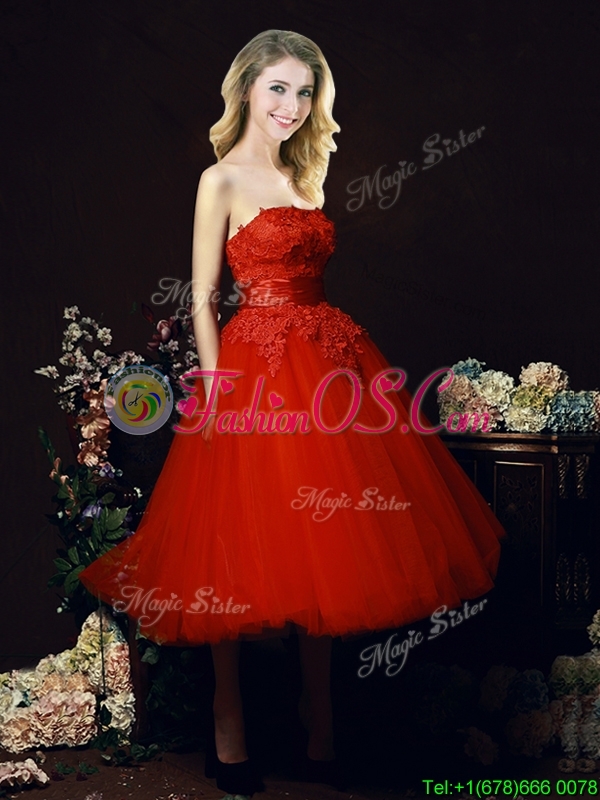 Perfect Puffy Skirt Strapless Applique Tea Length Red Dama Dress