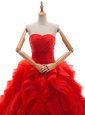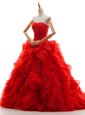 Home >  Wedding Dresses >  Perfect Wedding Dresses > Perfect Red Tulle Lace Up Bridal Gown Sleeveless Brush Train Ruffles and Ruching