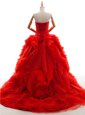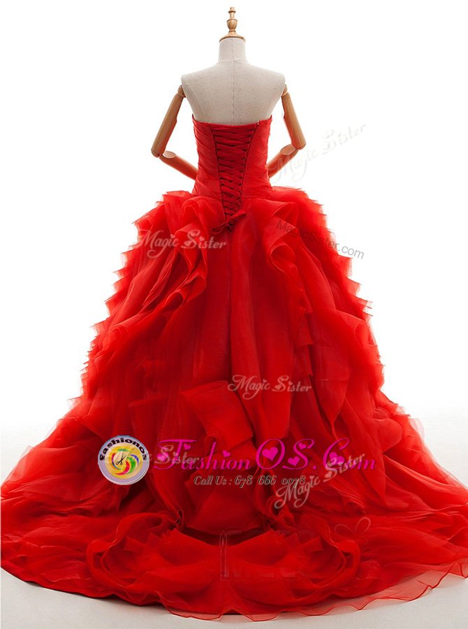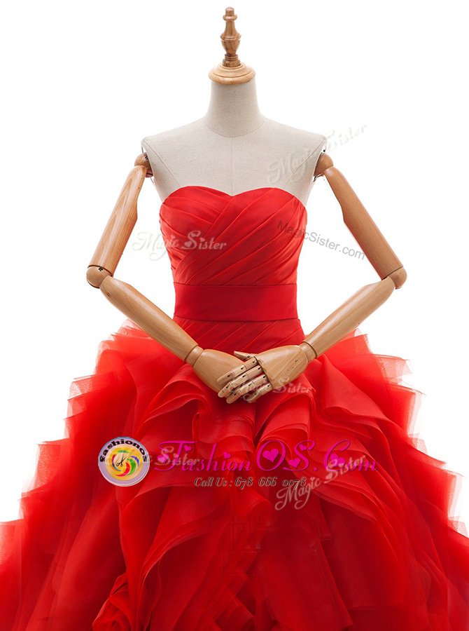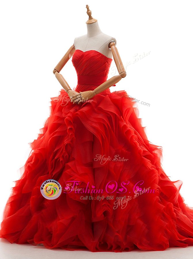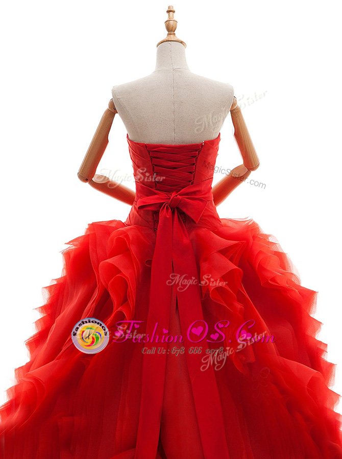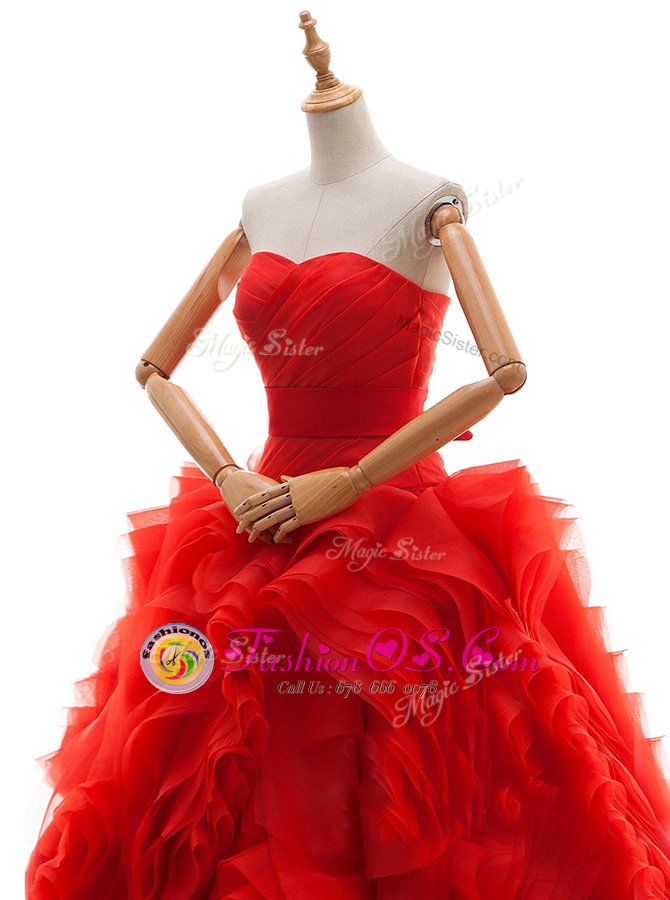 Perfect Red Tulle Lace Up Bridal Gown Sleeveless Brush Train Ruffles and Ruching