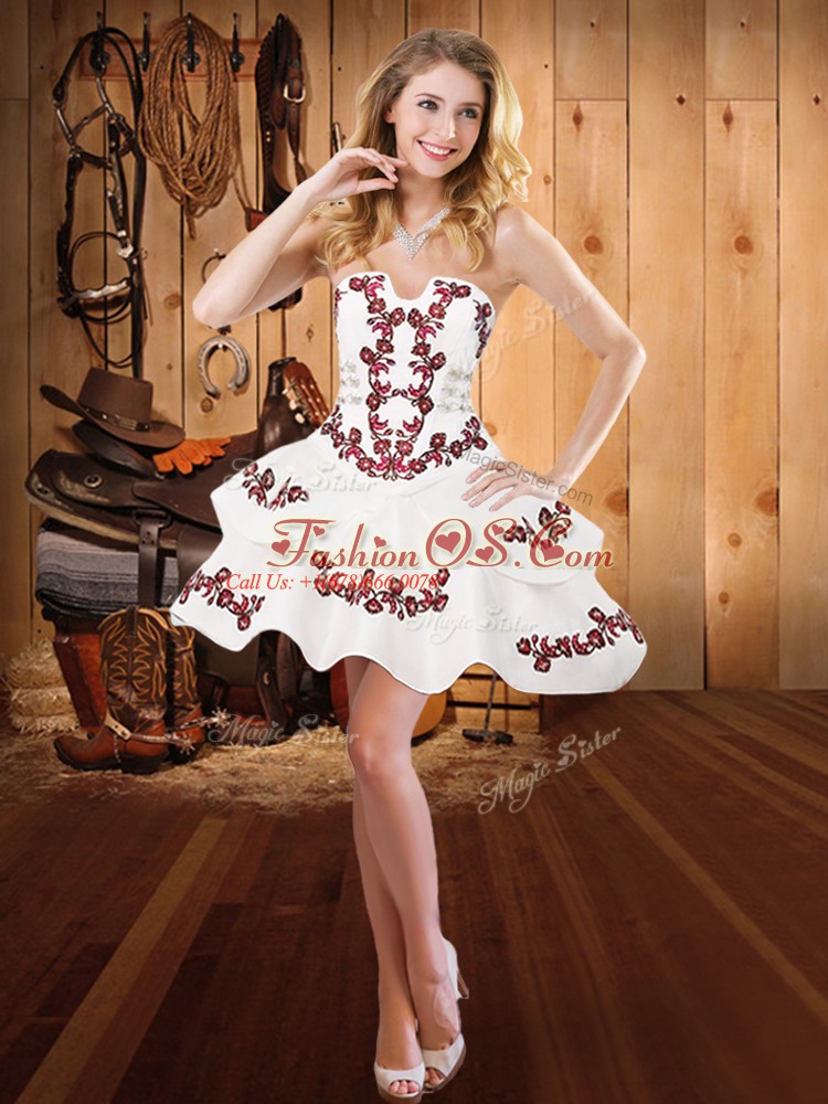 Perfect Satin and Organza Strapless Sleeveless Lace Up Embroidery and Ruffled Layers Quince Ball Gowns in Burgundy