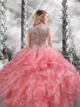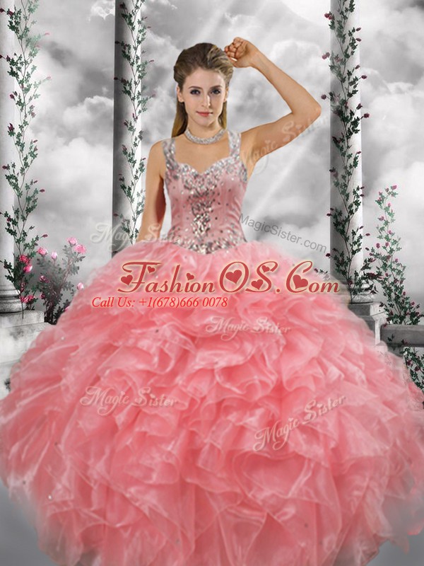 Perfect Straps Sleeveless Quinceanera Gowns Floor Length Beading and Ruffles Watermelon Red Organza
