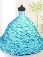 Home >  Quinceanera Dresses >  Discount Quinceanera Dresses > Pick Ups With Train Aqua Blue Ball Gown Prom Dress Strapless Sleeveless Sweep Train Lace Up