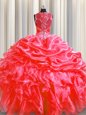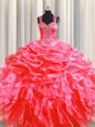 Home >  Quinceanera Dresses >  Clearance Quinceanera Dresses > Pick Ups Zipper Up See Through Back Floor Length Coral Red Quinceanera Dress Organza Sweep Train Sleeveless Beading and Ruffles