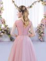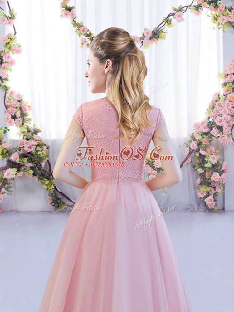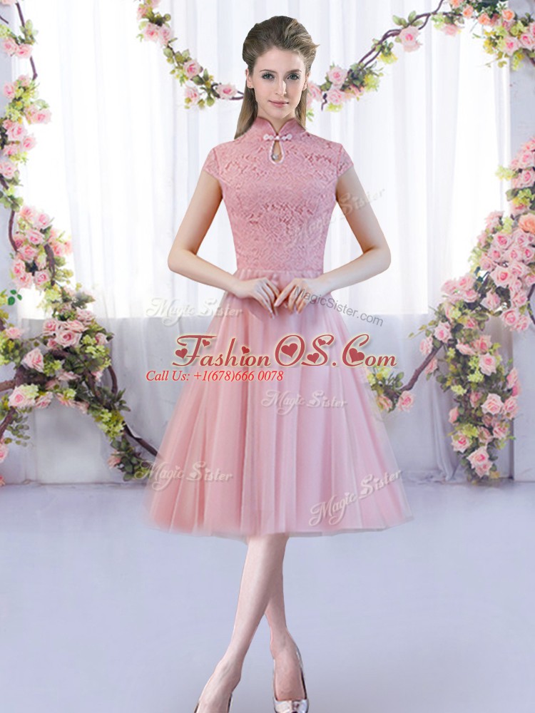 Pink A-line Lace Vestidos de Damas Zipper Tulle Cap Sleeves Tea Length