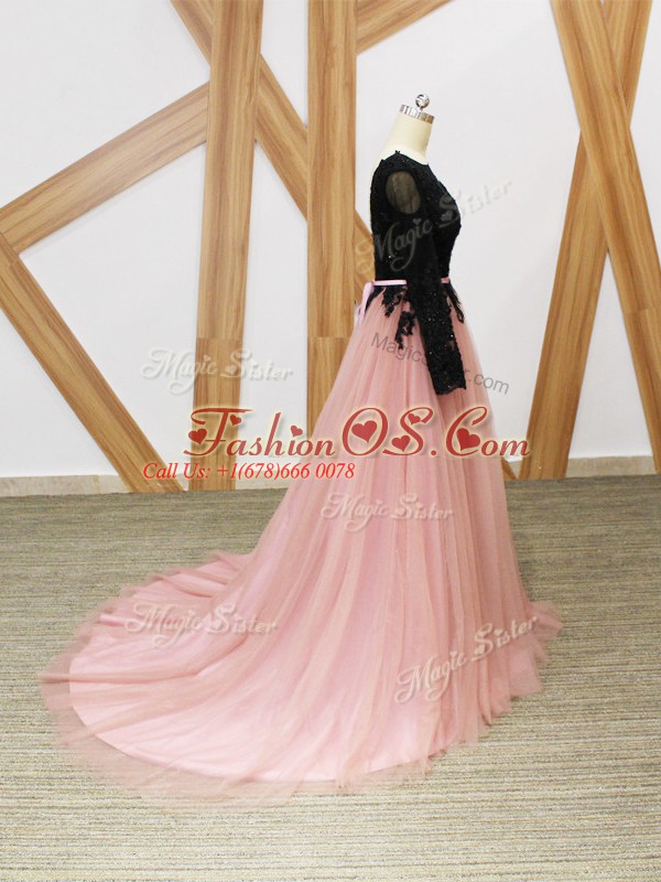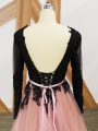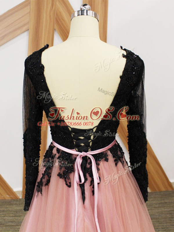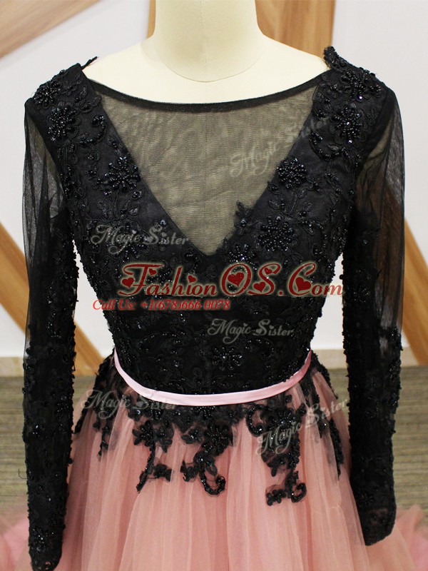 Pink And Black Empire Lace and Appliques and Sashes ribbons Celebrity Inspired Dress Zipper Tulle Long Sleeves