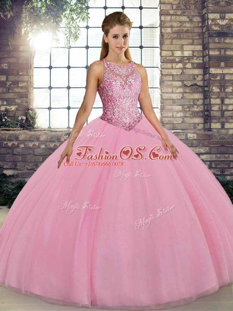 Pink Ball Gowns Embroidery Quince Ball Gowns Lace Up Tulle Sleeveless Floor Length